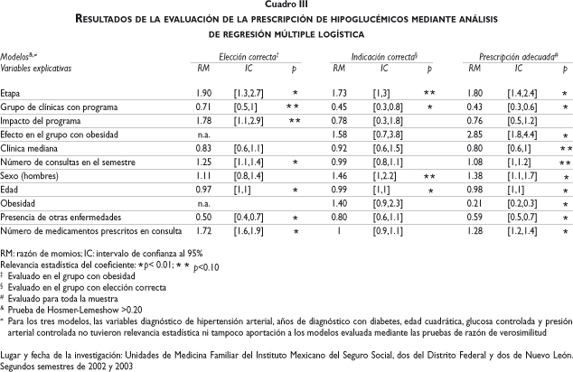 Para el modelo de prescripción adecuada se encontraron como variables de ajuste positivo: etapa, número de consultas, ser hombre y número de fármacos prescritos en la consulta. Con ajuste negativo se identificaron hallarse incluido en el grupo de clínicas elegido para el programa, pertenecer a clínicas medianas, edad, presencia de otras afecciones y obesidad. En el análisis estratificado por condición de obesidad se encontró una razón de momios de la variable impacto para el grupo con peso normal de 0.4, mientras que para obesos de 3.6, en ambos casos significativa. En consecuencia, se incluyó en el modelo general la interacción impacto-obesidad que mostró un efecto ampliamente favorecedor (185%), en tanto que el impacto del programa en la muestra total no resultó relevante.