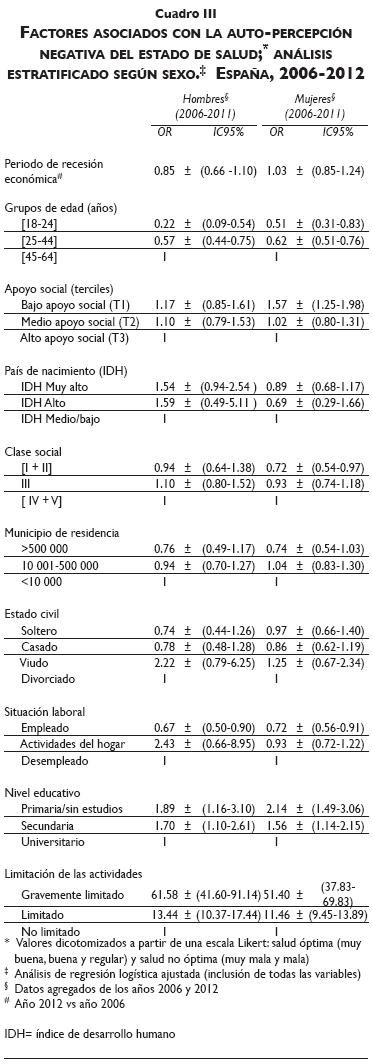 El otro indicador estudiado, salud autopercibida calificada como óptima, no ha mostrado cambios significativos en la población, asociados con el periodo de recesión económica (ORhombres=0.85; IC95% 0.66-1,10; ORmujeres=1.03; IC95% 0.85-1.24). El análisis de regresión múltiple demostró que la variable "Estado de salud autopercibida" se asociaba con una percepción negativa para los que tenían menor nivel de estudios (sin estudios/primaria; ORhombres=1.89, p<0.01; ORmujeres 2.14, p<0.01) y aquellos con una importante limitación de sus actividades diarias (gravemente limitado; ORhombres= 61.58, p<0.01; ORmujeres= 51.40, p<0.01). Como variables asociadas con una percepción positiva del estado de salud, se encuentran el intervalo de edad entre 16 y 44 años y el tener una situación laboral de empleo (ORhombres 0.67, p<0.01; ORmujeres 0.72, p<0.01) (cuadro III).