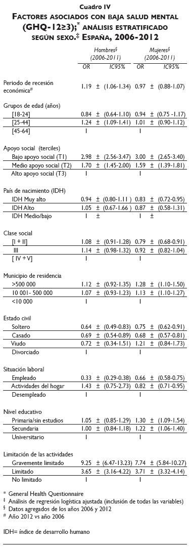 Los cambios observados en la evolución de los casos de disfunción o deterioro mental (GHQ-12 ≥3) durante el periodo de declive económico no son homogéneos entre ambos sexos. El análisis ajustado muestra que el período de recesión económica se asocia con cambios significativos en este indicador de la salud mental. No obstante, la disfunción mental aumenta durante el periodo de crisis económica en hombres (OR=1.2; IC95% 1.1-1.3), mientras que en mujeres no muestra cambios significativos respecto al periodo de prerrecesión (OR=0.97; IC95% 0.88-1.07). Otro factor que influye sobre este indicador en hombres es la edad de entre 25 y 44 años (OR=1.24, p<0.01) (cuadro III). Al igual que ocurría con el consumo de ansiolíticos, se observa un gradiente en el aumento de casos de disfunción mental según disminuye el apoyo social y, de forma importante, cuando aumentan las limitaciones en las actividades diarias (ORhombres con discapacidad grave=9.25, p<0.01; ORmujeres con discapacidad grave=7.74, p<0.01). Para ambos sexos, el estar soltero y casado se asocia con menos casos de disfunción mental, específicamente, en mujeres pertenecientes a las clases sociales I y II (cuadro IV).