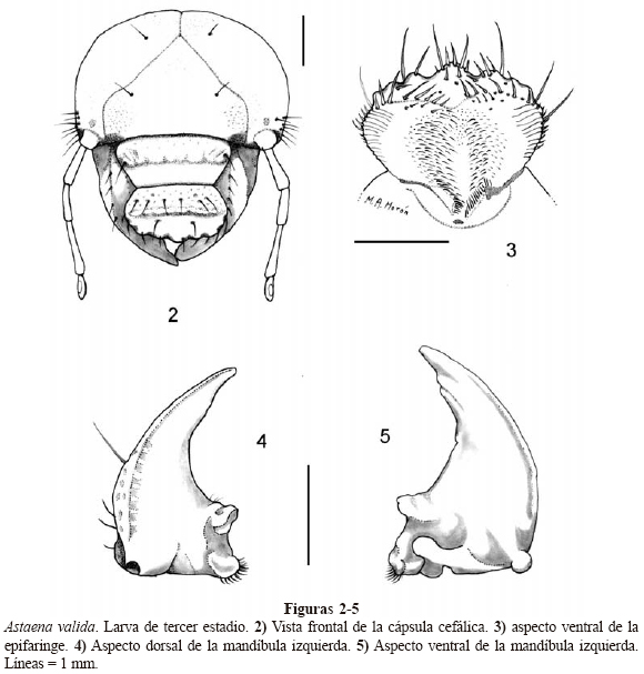Cabeza (Fig. 2). De aspecto ovalado, anchura 4.1- 4.2 mm, hipognata, cranium amarillo intenso, pigmentado en la región bucal; disco craneal aplanado, superficie lisa, algo micro rugosa; suturas poco visibles, la epicraneal en surco delgado, recto, poco pigmentado, sutura frontal inicialmente recta, después doble sigmoide; Cranium con una seta dorsoepicraneal, erecta, robusta, pigmentada, a cada lado, otras 3 a 4 setas craneales exteriores próximas a otro conjunto de 10-12 setas medianas y largas que bordean la región posterior de la inserción antenal, una seta larga aislada se ubica entre la inserción antenal y la precoila, otra seta se observa cerca a la inserción antenal próxima al conjunto de setas, en la parte media del cranium, cerca a la sutura frontal se observa una foseta. Ocelos visibles como minúsculas fosetas grisáceas.