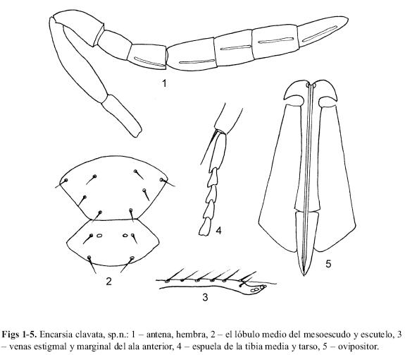 Comentarios. La antena con clava de 4 segmentos es muy rara en Encarsia (por ejemplo, E. nanjingensis Hayat y Polaszek), también la clava no clavada o no distintamente clavada (E. smithi Silvestri, E. sueloderi Polaszek, E. phaea Huang y Polaszek). En la fauna mexicana de Aphelinidae, E. clavata sp. n. es la primera especie nativa con clava de cuatro segmentos. Puede distinguirse de E. nanjingensis por lo siguiente: en E. nanjingensis - el lóbulo medio del mesoescudo con tres pares de sedas, ala anterior oscura bajo la vena marginal y cerca de tres veces tan largo como ancho, su fleco marginal de 0.63 veces tan largo como el ancho del ala, tercer válvula de 0.42 veces tan larga como el segundo valvífero, base del ovipositor al nivel del primer terguito, segundo segmento funicular sin sensila; en E. clavata - el lóbulo medio del mesoescudo con 4-5 pares de sedas, ala anterior hialina y 2.5 veces tan largo como ancho, su fleco marginal de 0.2-0.3 veces tan largo como el ancho de la ala, tercer válvula de 0.5 veces tan larga como el segundo valvífero, base del ovipositor al nivel del tercer terguito, el segundo segmento funicular con sensila.