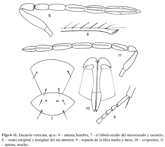 Comentarios. De acuerdo a la clave de Hayat sobre los grupos de especies de Encarsia (Hayat 1998), E. verticina sp. n. pertenece al grupo de especies parvella, pero difiere de todas las especies de este grupo por la tercer válvula, la cual tiene ápice redondeado con una pequeña excavación en el lado interno. En este grupo la coloración similar del metasoma (completamente pardo oscuro, excluyendo el séptimo terguito) lo tiene únicamente E. sueloderi Polaszek, descrita de Costa Rica (Mound et al. 1994). Pero Encarsia verticina puede distinguirse de E. sueloderi por lo siguiente: en E. sueloderi la cabeza es uniformemente pardo, el lóbulo medio del mesoescudo con 4 pares de sedas, antena con clava no clavada, ovipositor tan largo como la tibia media; en E. verticina - la cabeza es amarilla, el lóbulo medio del mesoescudo con dos pares de sedas, la clava antenal con dos segmentos, ovipositor más corto que la tibia media (0.9X).