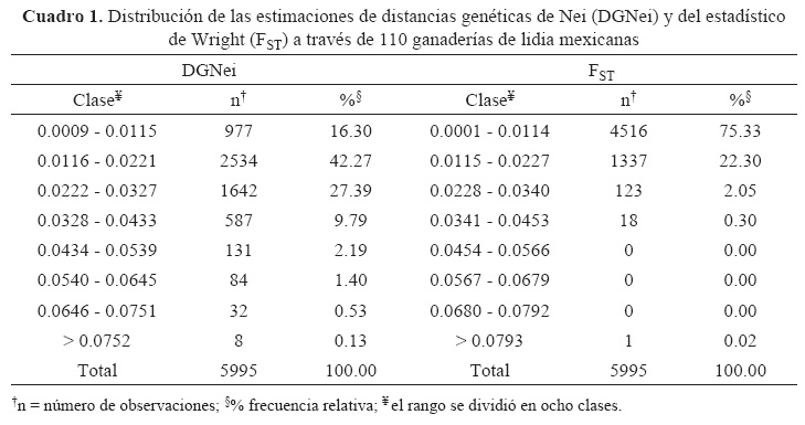 En el Cuadro 1 se describen los resultados de las DGNei y del estadístico FST. Las estimaciones de FST fluctuaron de 0.0001 a 0.0909, con un promedio general de 0.0086; el 97.63% fueron menores a 0.0228 y solo una estimación fue superior a 0.0454. Las estimaciones promedio de FST dentro de cada ganadería oscilaron entre 0.0021 y 0.0249. El valor promedio de FST reveló que sólo 0.86% de la varianza genética puede ser atribuida a diferencias entre poblaciones, el 99.14% de la varianza genética restante se atribuye a las diferencias entre individuos dentro de poblaciones. Con las estimaciones promedio del estadístico FST, a través de ganaderías puede existir un intercambio promedio de 29.2 reproductores, con máximos de 118.8. El FG determina hasta qué punto cada subpoblación es una unidad independiente; con gran cantidad de FG, las sub poblaciones evolucionan juntas, pero si existe bajo FG, entonces cada subpoblación evoluciona de forma independiente (Real 1994). Las medidas de diferenciación o distancias basadas en el estadístico FST pueden ser apropiadas para procesos evolutivos de corto plazo, especialmente si el tamaño efectivo de las poblaciones varía en tiempo y espacio (Reynolds et al. 1983; Nagylaki 1998). En estudios similares con ganaderías de Lidia españolas, Sanz et al. (2011) reportaron que el 9% de la variabilidad fue explicada por las diferencias entre las 16 ganaderías evaluadas; de la misma forma, Cañón et al. (2007a) estimaron que 20% de la variabilidad global, a través de 77 ganaderías, fue explicada por subdivisiones o conjuntos de ganaderías denominadas encastes. Estimaciones de FST superiores a las del presente estudio fueron publicados por Jordana et al. (2003), al evaluar la estructura genética de 18 razas de bovinos para carne de origen europeo; estos autores estimaron que 6.8% de la varianza fue explicada por las diferencias entre poblaciones y el remanente (93.2%) fue atribuida a las diferencias entre individuos. Las estimaciones de FIS oscilaron de -0.3333 a 0.0099, con un promedio general de -0.0167.