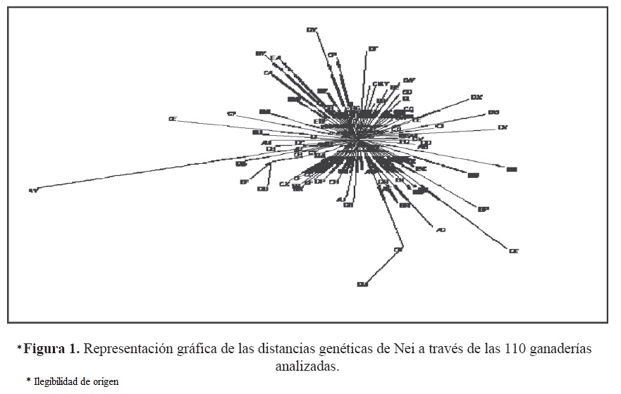 En la Figura 1 se presenta en forma gráfica las DGNei a través de las ganaderías analizadas. Las estimaciones fluctuaron de 0.0009 a 0.0859 (Cuadro 1), con promedio de 0.0217. El 16.30% de las estimaciones fueron menores de 0.0116; alrededor del 70% oscilaron entre 0.0116 y 0.0327, mientras que ocho estimaciones (0.13%) fueron superiores a 0.0752 (Cuadro 1); dentro de ganadería, los promedios oscilaron entre 0.011 y 0.064. Las ocho estimaciones superiores a 0.0752 se ubican en los extremos de la Figura 1. De acuerdo con el acomodo de las ganaderías en la Figura 1, no se observó una diferenciación en posibles grupos o conjuntos de ganaderías; estos resultados se pueden atribuir a que las bajas estimaciones (poca diferenciación) de las distancias genéticas, no pueden separar a las ganaderías en función de ciertos agru-pamientos. Resultados diferentes fueron publicados por Cañón et al. (2007b); los árboles filogenéticos reportados por estos autores señalan dos hechos importantes: 1) el origen está presente en todas las ramas principales del árbol de relaciones genéticas; y, 2) la estrecha correlación que puede observarse entre la génesis de las ganaderías y las relaciones genéticas entre ellas reflejadas en el árbol.
