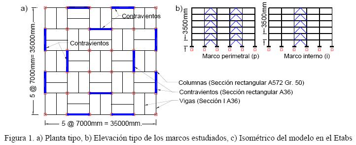 Se diseñaron tres edificios regulares estructurados con marcos dúctiles de acero con contraventeo concéntrico de 10, 14 y 18 niveles (Ch10_56, Ch14_61 y Ch18_69), cuya configuración se presenta en la figura 1, ubicados en suelo blando (zona IIIa) siguiendo los criterios del Reglamento de Construcciones para el Distrito Federal (RCDF-04) y una propuesta de diseño por capacidad para estos sistemas estructurales.