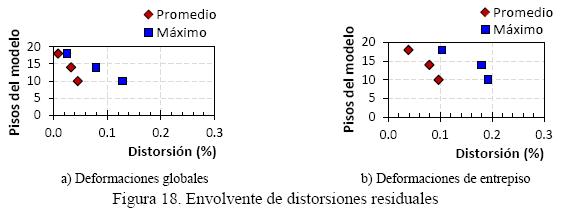En la figura 18a se presentan las envolventes de las distorsiones residuales globales, es decir, las deformaciones permanentes después de efectuados los análisis dinámicos en función de la cantidad de pisos de los modelos, mientras que en la figura 19b se reportan las distorsiones máximas de entrepiso. Como se aprecia, aún en la mayor solicitación (distorsión máxima), los resultados las distorsiones permanentes son menores al 0.2%, pese a que los modelos presentan daño significativo en los elementos que lo conforman (figura 13).
