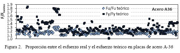 Se consideraron un total de 260 certificados de acero tipo A - 36, de los cuales el 92.3 por ciento eran de fabricantes nacionales y un 7.7 por ciento provenían de fabricantes extranjeros (China y Estados Unidos). El esfuerzo de fluencia promedio resultó ser igual a fy = 3,264 kg/cm2, que representa un factor 1.29 veces más grande que el esfuerzo de fluencia teórico fy = 2,530 kg/cm2). El menor esfuerzo de fluencia se presentó en una placa de 5/16" (0.79 cm) fabricada en Estados Unidos con fy min = 2, 559 kg/cm2, mientras que el mayor esfuerzo de fluencia se reportó en una placa de 3/8" (0.95 cm) fabricada en México con una magnitud de fy max = 4,675 kg/cm2.