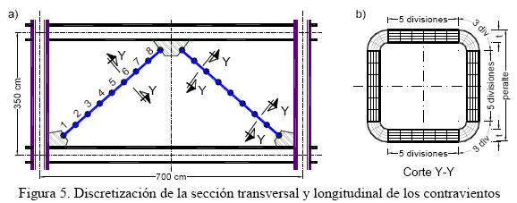 Las vigas de las crujías no contraventeadas se modelaron usando el elemento con articulaciones en los extremos (BeamWithHinges), en el que la plasticidad se concentra en la longitud de la articulación definida en los extremos del elemento, con una respuesta elástica en el segmento central. Las vigas de las crujías contraventeadas se dividieron en fibras con forma cuadrilátera con un elemento (NonlinearBeamColumn) en el que la plasticidad se distribuye a lo largo del elemento.