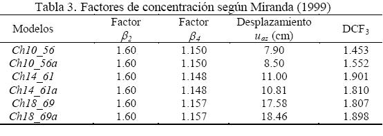 En la determinación del factor de concentración de distorsión se consideró que la ductilidad es igual a la ductilidad determinada en la metodología propuesta (ec. 2); la proporción α es igual a la aportación de las columnas en relación a los contravientos (ec. 1) y el parámetro β se determinó considerando la carga lateral actuante y el cortante lateral resistente de diseño. Los factores de concentración se reportan en la tabla 2.