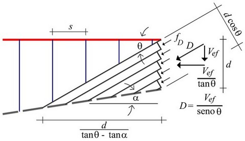 Si por equilibrio se iguala el cortante efectivo externamente aplicado con el cortante nominal resistido internamente ( Vn=Vef ), toda vez que se estima directamente V s como se indicó anteriormente, la contribución total del concreto, V c , se obtiene indirectamente a partir de la ecuación 1 como Vc=Vn-Vs .