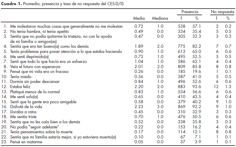 De los 943 estudiantes que participaron, 873 (92.5%) contestaron la prueba completa de CESD/IS (23 reactivos). El cuadro 1 muestra la media y mediana grupal de los 23 reactivos, así como la presencia (durante la semana previa, sin importar el número de días) y la frecuencia de no respuesta observada en cada uno de los reactivos que conforman el cuestionario. Los reactivos de la dimensión de afecto positivo, según Radloff,27 presentaron promedios y presencia más altos (estos reactivos se evalúan de manera inversa a los demás, así que a "mayor valor menor presencia"). Los reactivos "Tenía pensamientos sobre la muerte", "Sentía que mi familia estaría mejor si yo estuviera muerto" y "Pensé en matarme" presentaron las siguientes frecuencias: 12.1, 7.1 y 3.1%, respectivamente. Respecto a la tasa de no respuesta, el reactivo "Estaba feliz" fue el menos respondido (1.3%).