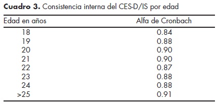 En México, la escala CESD de Radloff27 ha demostrado ser apropiada para evaluar la sintomatología depresiva en estudiantes del nivel de educación media (secundaria) y media superior (bachillerato). La consistencia interna referida en estos estudios fue satisfactoria, con coeficientes alpha de Cronbach de 0.84,25 0.9034 y 0.83.35