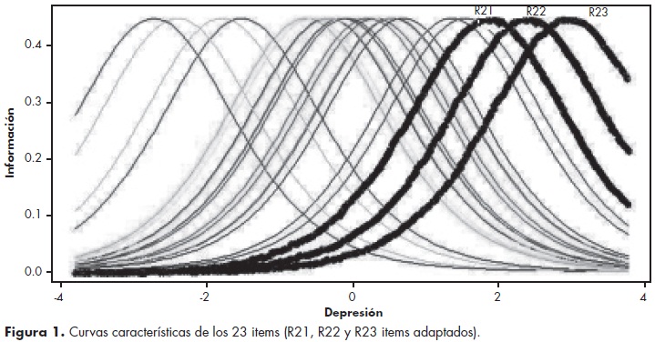En la figura 1 se muestra la aplicación del modelo Rasch, para lo cual se dicotomizaron los 23 reactivos de la siguiente manera: Un valor 0 para la opción de "0 número de días" y un valor 1 para las opciones "12, 34, 57 número de días". Las curvas características de los reactivos representadas gráficamente muestran los reactivos R21, R22 Y R23 en la parte extrema derecha en el continuo de la sintomatología depresiva. En este continuo (eje x), la parte izquierda significa niveles bajos en la sintomatología depresiva y la parte derecha niveles altos. Esto muestra que el factor II aporta una mayor sensibilidad al constructo para la detección de puntuaciones altas de la sintomatología depresiva.