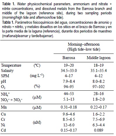 La temperatura varió entre 18°C y 20°C. La salinidad fue ligeramente menor en el brazo interno de Barrosa, reflejando los pequeños aportes de agua dulce durante la bajante (tabla 1). La concentración de la materia particulada en suspensión fue mayor durante la bajamar en ambos sitios. Los niveles de oxígeno disuelto fueron aproximadamente 100% de saturación y las mayores diferencias de pH se observaron en Barrosa. En ambos sitios el amonio explicó entre el 80% y el 93% de las concentraciones de nitrógeno inorgánico total, siendo más alto en Barrosa (44-53 μM) que en la parte media de la laguna (16-28 μM). Se observó una diferencia similar entre las estaciones de muestreo respecto a las concentraciones de nitrato + nitrito (5.1-13 y 1.8-2.0 μM, respectivamente). En Barrosa se registraron concentraciones más altas durante la bajamar, lo que sugiere la influencia de descargas de agua dulce enriquecidas con nutrientes.