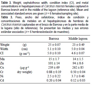 El peso (g), el ancho del cefalotórax (cm) y el índice de condición (calculado como la razón entre peso húmedo y ancho del cefalotórax) de las hembras de C. maenas de las dos estaciones de muestreo no resultaron significativamente (P < 0.05) diferentes (tabla 3). Los niveles de Cu, Zn, Mn y Ni en el hepatopáncreas no variaron significativamente entre estaciones (tabla 3), pero los de Cr y Cd fueron más elevados en el hepatopáncreas de las hembras capturadas en Barrosa (0.88 ± 0.19 y 0.20 ± 0.04 μg g-1, respectivamente) que en las capturadas en la parte media de la laguna (0.50 ± 0.04 y 0.12 ± 0.03 μg g-1, respectivamente).