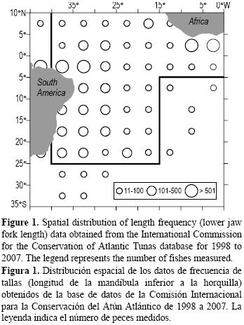 Se obtuvieron datos de la distribución de frecuencia de tallas (longitud de la mandíbula inferior a la horquilla [LMIH], en centímetros) de la base de datos de ICCAT de peces capturados por las pesquerías con palangre y redes de enmalle que operan en el Atlántico ecuatorial y sudoccidental. Los datos se agruparon en cuadrantes de 5° × 5° considerando la posición inicial de la operación de pesca, por mes, año, latitud y longitud, de 1998 a 2007. Se utilizó un total de 9954 datos de LMIH, de los cuales 7541 fueron de capturas de las flotas palangreras de Brasil, Venezuela y España, y 2413 fueron de capturas de las pesquerías con redes de enmalle que operan en Ghana, Costa de Marfil y Venezuela. La distribución espacial y la densidad de estos datos se muestran en la figura 1. Para evaluar la distribución espacial por longitud, se establecieron las siguientes dos clases de LMIH siguiendo los procedimientos descritos por Jolley (1977) y Mourato et al. (2009a): (a) <155 cm, individuos inmaduros (o jóvenes), y (b) >155 cm, individuos maduros (o adultos). Estos datos se transformaron en la proporción de jóvenes y adultos, por cuadrante de 5° × 5°, suponiendo una distribución binomial.