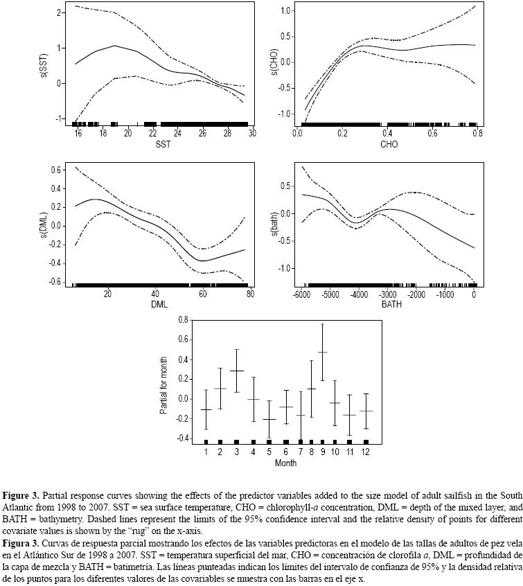 Como parte de la herramienta GRASP, se utilizan modelos aditivos generalizados (MAG) para ajustar las variables de respuesta a las variables ambientales explicativas usando una función suavizante no paramétrica (Hastie y Tibshirani 1990). Tal método ha resultado ser adecuado en el caso de los recursos pesqueros. Inicialmente se aplicó en el Océano Atlántico Sur para modelar la distribución espacial del pez espada (Xiphias gladius), usando datos de las pesquerías comerciales con palangre de Brasil (Hazin y Erzini 2008). En el presente trabajo se aplicó GRASP a los datos de talla del pez vela capturado con palangre y red de enmalle proporcionados por ICCAT, para un mejor entendimiento de la relación entre la distribución de tallas y los factores espaciales y ambientales.