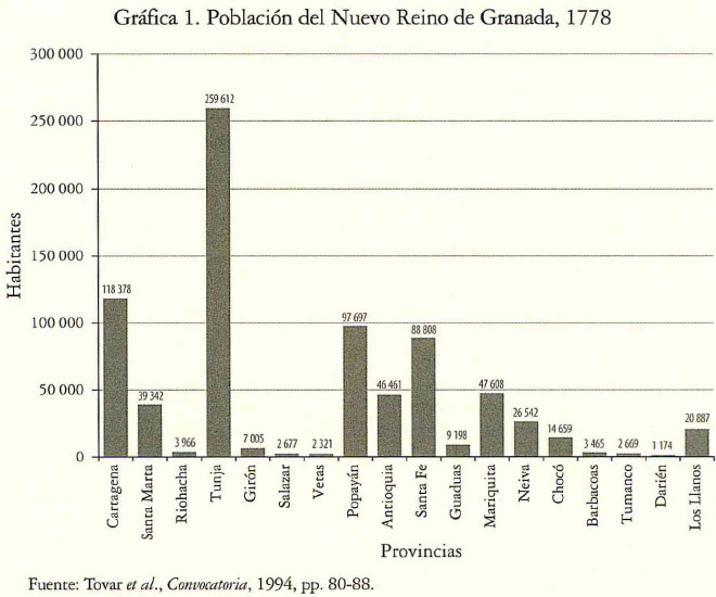 56 El corregidor de Zipaquirá, Pedro Fermín de Vargas apuntó: "Para conocer cuan cortos son los recursos de esta población y lo poco que debe esperarse de ella, no hay más que calcular el número de nacidos en cada un año, suponiendo, como dije, que el número de habitantes del reino sea de 2 000000; y correspondiendo siempre el número de los que nacen al de los existentes en razón de 1 a 23 y 24, y aun más en las ciudades según el comercio y extensión, calcularemos por un término medio que será por 24, diciendo: 2 000 000 por este número, el resultado son 83 333, que es el número de nacidos en año común. Por el mismo estilo se ha llegado a conocer que los muertos son a los vivos como 1 a 29; y haciendo a la misma operación, resultan 68 965 muertos en año común, que resultados los 83 333, dejan 14 368, que sería el aumento de nuestra población en cada año; y la que cendríamos dentro de 25 sería, según el mismo principio, 3 059 200, con corta diferencia. Así, pues, para que llegase esta colonia a tener la población que necesita y puede alimentar, sería preciso que pasasen millares de siglos, y que no hubiese en tiempo alguno enfermedades epidémicas". Ibid., pp. 131-132.