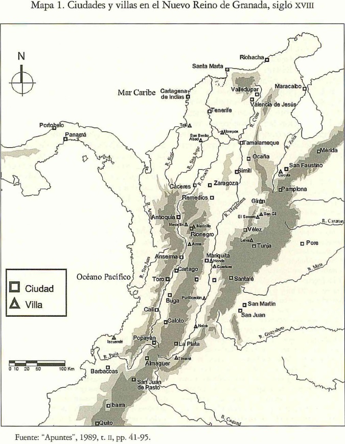 59 En 1772, el fiscal protector de naturales de la Real Audiencia de Santa Fe, Antonio Moteno y Escandón, informaba al virrey Pedro Messia de la Zerda que en el Nuevo Reino: "la mayor parte de su vasto y dilatado territorio se mantiene desierto e inculto y muy falto de población y de gentes que lo habiten y se dediquen a la agricultura de sus frutos y fomento de su comercio, no pudiendo negarse que cada día se va aumentando la población, y que es regular que con el tiempo crezca y se facilite por medio de la industria de los habitantes, la labor de las tierras, y sucesivamente el comercio y trato, en que sufre considerables atrasos el reino". Véase, "Estado", 1989, t. I, p. 202.