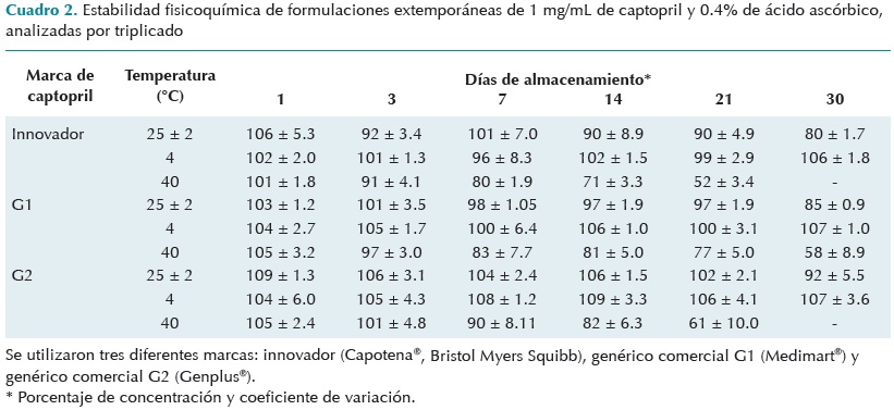 El Cuadro 2 muestra la estabilidad fisicoquímica de las formulaciones extemporáneas de captopril de 1 mg/mL en los días 1, 3, 7, 14, 21 y 30. Las preparaciones realizadas con el fármaco innovador y el genérico Medimart® (G1) fueron estables (concentración 90-110% del valor nominal) hasta por treinta días a 4°C, por veintiún días a temperatura ambiente y sólo por tres días a 40°C. Las preparaciones del genérico Genplus (G2) fueron igualmente estables por treinta días almacenadas a temperatura ambiente y a 4°C; sin embargo, tuvo mayor estabilidad a 40°C (siete días) que las preparaciones anteriores.