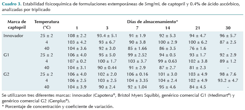 El Cuadro 3 muestra la estabilidad fisicoquímica de las formulaciones extemporáneas de captopril de las tres marcas analizadas en concentración de 5 mg/mL. Todas las formulaciones analizadas fueron estables a temperatura ambiente durante treinta días; las preparaciones del fármaco innovador y del genérico G1, preservadas a 4°C, fueron estables por veintiún días mientras la del genérico G2 lo fue hasta por treinta días. A 40°C la estabilidad del captopril en las preparaciones fue variable; el fármaco innovador se conservó por tres días; el genérico G1 se mantuvo por siete días mientras que el G2 permaneció estable hasta por catorce días.