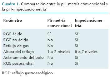 Dentro del área pediátrica parece que esta técnica ofrece mayores beneficios y ventajas en cuanto al entendimiento y valoración en pacientes con reflujo gastroesofágico. Al no ser dependiente de un estado ácido, como en la vigilancia del pH intraesofágico, la impedanciometría puede detectar cualquier episodio de reflujo ya sea ácido o no ácido. Así mismo, detecta la dirección del bolo y permite así evaluar la función motora del esófago. En el Cuadro 1 se hace una comparación entre la pHmetría convencional y la pH impedanciometría.14