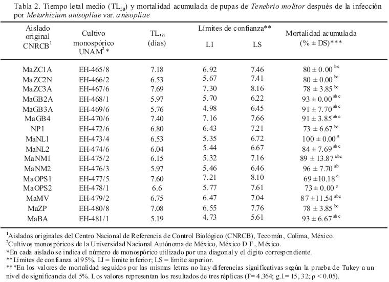 La mortalidad de los insectos está relacionada a la concentración de conidios de M. anisopliae (Butt y Goettel, 2000). En estudios previos utilizando Beauveria bassiana y Metarhizium anisopliae contra Conotrachelus psidii (Coleoptera: Curculionidae), se encontraron mortalidades entre 26.6 y 88.6% en diversos aislados (Brito et al., 2008). En Hypothenemus hampei (Coleoptera: Scolytidae), se observó una mortalidad entre 11 y 34% al utilizar dosis entre 1.3 a 2.9 x 107 conidios/mL con cinco cepas de M. anisopliae (De la Rosa Reyes et al., 1995). En nuestro trabajo, en infección de un coleóptero con M. anisopliae se alcanzó una mortalidad del 100% con un aislado, y para los demás, la mortalidad varió de 69 a 96 % pero nunca fue menor. La cantidad de conidios utilizada debe alcanzar cierta concentración para obtener una penetración efectiva del hongo en la cutícula del insecto y así ocasionar la muerte del hospedero (Zhioua et al., 1997).