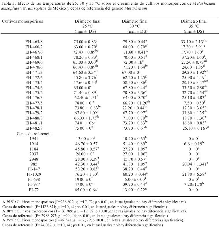 A 35°C, los aislados de México que alcanzaron el mayor crecimiento fueron EH468/1, EH474/6, EH479/2, EH465/8 y EH475/2 a diferencia de los aislados EH466/2, EH467/6, EH478/1, EH480/8 y EH481/1 que mostraron el menor crecimiento (Tabla 3). A esta temperatura, el crecimiento de las cepas de referencia disminuyó considerablemente con excepción de las cepas FI1029 (CSIRO) de Eritrea y 985 (ARSEF) de Australia que registraron un crecimiento intermedio. Estas dos cepas corresponden a M. anisopliae var. anisopliae (FI1029), misma de los aislados de México y a M. anisopliae var. acridum de Australia. Las diferencias observadas en el crecimiento a 35 °C fueron significativas tanto entre los aislados de México (F=49.541; g.l.=17,72; ρ<0.01), todos de M. anisopliae var. anisopliae, como entre las cepas de referencia (F=74.087; g.l.=10, 44; ρ< 0.01), de diferentes especies de Metarhizium (Tabla 3). A 40 °C, ni los aislados de México ni las cepas de referencia tuvieron crecimiento.
