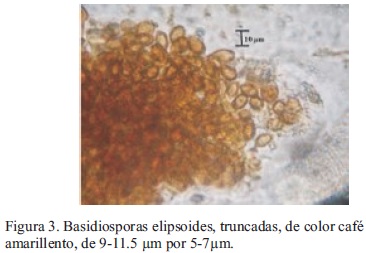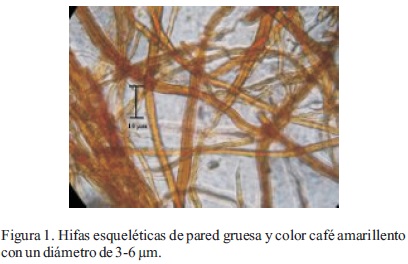 Las características morfológicas macroscópicas de los especímenes coinciden con las reportadas por Guzmán (1980) como Ganoderma sessile Murr.; sin embargo, de acuerdo con Bandala et al. (1993) y Ryvarden (2000), dicho nombre es un sinónimo de G. resinaceum Boud. Por otra parte, las características morfológicas tanto macroscópicas como microscópicas de los cuerpos fructíferos coinciden con la descripción de Ryvarden (2000) para la especie G. resinaceum, la cual se resume en: basidiocarpos perennes, pileados, sin estípite. De consistencia leñosa o semejante al corcho. Superficie superior plana, surcada, glabra, con una costra distintiva, al principio rojiza y brillante, y con la edad de color cada vez más café rojizo a bayo o grisáceo, debido a una capa resinosa excretada que se pone amarillenta y se derrite al contacto con la flama de un encendedor. Superficie de los poros de color blanco cremoso al principio y posteriormente ocrácea a gris pálido con tintes cafés. Tres a cuatro poros angulares o circulares por mm. Contexto café grisáceo pálido. Sistema hifal dimítico; hifas generativas hialinas, de pared delgada, con uniones de 2-5 µm de diámetro; hifas esqueléticas (Figura 1) abundantes, de pared gruesa y color café amarillento, de 3-6 µm de diámetro. En contacto con el reactivo de Melzer, las hifas esqueléticas presentan una leve reacción amiloide. Células de la cutícula (Figura 2) en forma de mazo, de al menos 50 µm de largo. Basidiosporas (Figura 3) elipsoides, truncadas, de color café amarillento, de 9-11.5 µm por 5-7 µm (Ryvarden, 2000).