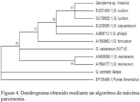 El subsecuente análisis filogenético, utilizando el algoritmo de máxima parsimonia y las secuencias reportadas en GenBank para cepas pertenecientes a 6 especies relacionadas dentro del género Ganoderma, una cepa local identificada como G. oerstedii (Mendoza et al., 2011) y Fomes fomentarius como clado externo (Figura 4), muestra que la cepa es conespecífica con la cepa GU726925.1 (identificada como Ganoderma lucidum), y no con las cepas identificadas como G. resinaceum (AM906065 y AY884177), como cabría esperar por su morfología, ni con la cepa local de G. oerstedii, reportada por Mendoza et al. (2011).