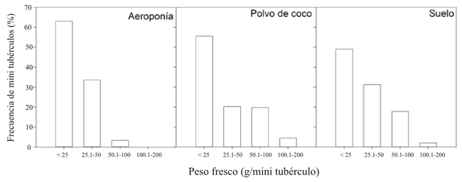 Aunque se produjo una mayor cantidad de mini tubérculos en plantas desarrolladas en aeroponía, el 96.6% de ellos resultaron pesar menos de 50 g y solo el 3.4% fue mayor de 50.1 g (Figura 3); esto se debe a que los mini tubérculos en aeroponía son cosechados justo en el momento en que alcanzan el tamaño deseado. En contraste, el 19.8 y 24.3% de los mini tubérculos fueron mayores de 50.1 g en plantas crecidas en polvo de coco o en suelo, respectivamente (Figura 3). Estos resultados coinciden con los reportados por Ritter et al. (2001) y Farran y Mingo-Castel (2006), quienes obtuvieron mini tubérculos de 9.89 y 8.9 g en una producción aeropónica.