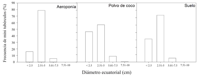 En cuanto a la distribución por tamaño se observa que aproximadamente el 75% de los mini tubérculos en aeroponía se encuentran entre 2.51-5 cm en diámetro polar (Figura 4) y ecuatorial (Figura 5), mientras que para el suelo los valores se encuentran entre 50 y 60% y para polvo de coco entre 35 y 50%. Estos resultados indican que en aeroponía los mini tubérculos son más uniformes en cuanto a peso y tamaño.