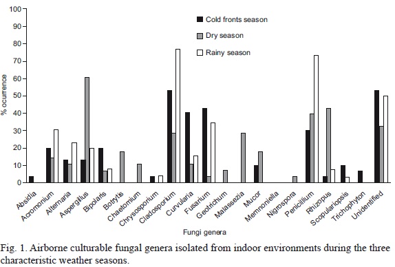 During the cold fronts season relative humidity varied from 30 to 69% outdoors and from 35 to 77% indoors; during the dry season, from 22 to 72% and from 31 to 73%, respectively. During the rainy season, relative humidity varied from 38 to 68%, and from 46 to 78%, outdoors and indoors, respectively. The composition of fungal aerosols also exhibited a seasonal variation according to the climatic conditions of the area. Temperatures ranged between 25 and 38 °C, from 27 to 41 °C and from 25 to 33 °C during the cold fronts, dry and rainy seasons, respectively.