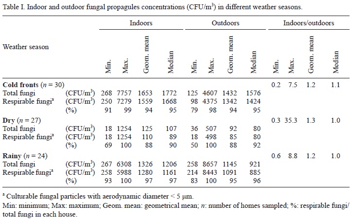 The concentration of fungal propagules found during the three characteristic weather seasons in the region is shown in Table I. During the cold fronts season the geometric means were 1653 and 1432 CFU/m3 at indoor and outdoor environmental air, respectively; while during the dry season they were 125 CFU/m3 indoors and 92 CFU/m3 outdoors. During the rainy season the geometric means of these concentrations were 1326 and 1145 CFU/m3, respectively. The respirable fungal particles found during all seasons were between 50 to 100% of the total fungal concentrations.