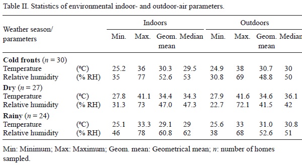 The indoor/outdoor ratios (I/O) for fungal aerosols are also shown in Table I. These I/O ratios for the cold fronts season were between 0.2 and 7.5 with a median of 1.1. For the dry season, the fungal aerosols I/O ratios median value was 1.0, with a range from 0.3 to 35.3. For the rainy season, these I/O ratios were between 0.6 and 8.8, and their median was also 1.0.