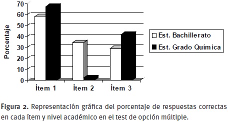 La aplicación de la prueba estadística "chi cuadrado" a la tabla de contingencia anterior produce el siguiente resultado: χ2 = 0,62 (g. l. = 1), p>0,05; en consecuencia, no hay diferencias estadísticamente significativas entre los estudiantes de 2° de Bachillerato y 1° de grado de Químicas en este ítem.