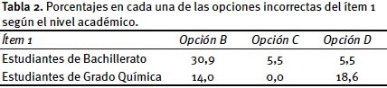 A continuación analizaremos los resultados que ponen de manifiesto ideas alternativas por parte de los alumnos en este ítem. En la tabla 4 se muestran los porcentajes de alumnos universitarios y de Bachillerato que no han respondido correctamente distribuidos por opciones.
