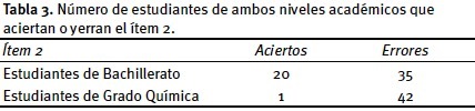 La aplicación de la prueba "chi cuadrado" a la tabla de contingencia anterior proporciona el siguiente resultado: χ2 = 1,22 (g. l. = 1), p > 0,05; en consecuencia, no hay diferencias estadísticamente significativas entre los estudiantes de 2° de Bachillerato y 1° de Químicas en el ítem 3.