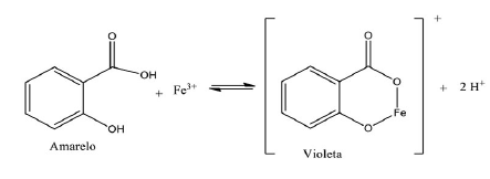 De acordo com Silva e Marins (2010) o AS possui um grupo fenólico em sua estrutura química, forma complexos de cor vermelho ao violeta quando reagem com íons metálicos de Ferro III, conforme visto na Figura 1, observado nos testes positivos (+) relatados na Tabela 3. Enquanto que esta complexação não ocorre com o AAS, pois este não possui um grupo fenólico. Neste caso a solução fica amarela (coloração da solução original do FeCl3 1%), visto nos testes negativos (-).