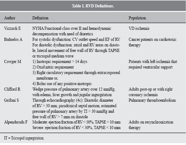 Staging of functional class has a direct proportional relationship with right and left ventricular claudication.19 Vizzardi E and cols20 defined for their association study of echocardiographic factors with RVD exclusively the following: Functional Class over II by the New York Heart Association (NYAH), hemodynamic decompensation episodes over six months and the need of diuretic therapy.20,21 On table I, some definitions of RVD used by some authors in different conditions are shown; these can vary hence the need to have a standard definition that will allow to identify RVD worldwide is evident.