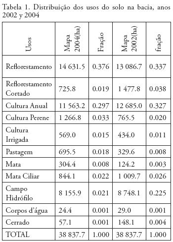 Na Tabela 1, verifica–se o uso do solo da bacia do Ribeirão Piçarrão nos anos de 2002 e 2004. Observa–se que no ano de 2002 o reforestamento representou 33.7%, o reforestamento cortado 3.8%, a cultura anual 32.7%, a cultura perene 2.0%, a cultura irrigada 1.1%, a pastagem 0.8%, a mata 0.3%, a mata ciliar 2.6%, o campo hidrófílo 22.5%, os corpos d'água 0.1% e o cerrado 0.4%.
