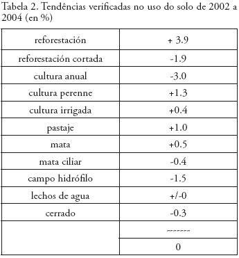 De acordo com Gifoni (2005), os mapas de uso do solo foram produzidos a partir de imagens do ano de 2002 (Figura 2) e 2004 (Figura 3), ñas quais foram encontradas as classes de: reforestamento, reforestamento cortado, cultura anual, cultura perene, cultura irrigada, pastagem, mata, mata ciliar, campo hidrófílo, corpos d'água e cerrado. Essas classes sofreram algumas modificações quanto à extensão, forma e quantidade, e não são perceptíveis apenas com a observação do mapa. Contudo, por meio de cálculos de área gerados no programa "spring 4.1" em hectares, foi possível tabular esses dados e gerar urna tabela (Tabela 1), para melhor expressar os resultados em porcentagem.