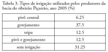 A irrigação (Tabela 3) é a prática que melhor caracteriza o uso de tecnología, adotada por 62.5% dos estabelecimentos pesquisados, entre os quais 37–5% utilizam a irrigação por gotejamento, 12.5% por tripa e 6.25% dos entrevistados utilizam o pivó central. Entre os produtores entrevistados, 12.5% utilizam em suas propriedades pivó e gotejamento e 31.25% não irrigam suas terras. De acordo com mapa de uso do solo e com a pesquisa de campo, constata–se que a área total drenada é de 388 km2 e foram identificados nove pivôs na bacia do ribeião Piçarráo.