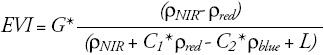 Os índices de vegetação EVI e NDVI foram obtidos por meio da reflectância das bandas do sensor RapidEye. O EVI foi obtido com o uso da Equação 1, apresentada por Huete et al. (2002):