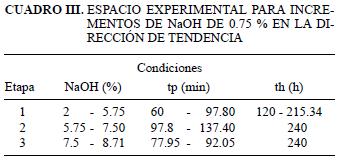 Para la definición del espacio experimental se determinaron las tendencias de optimización mediante un ajuste lineal de los resultados (ecuación 1), las cuales están especificadas por las ecuaciones 2 y 3. El espacio experimental explorado se obtuvo para incrementos de la concentración de NaOH de 0.75 % en la dirección de tendencia (Cuadro III).