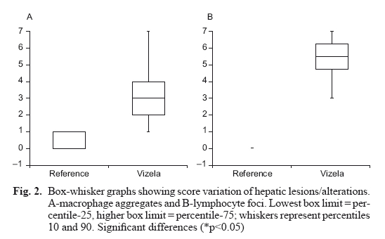 The hepatic foci of lymphocites, observed only in fish from Vizela River, could be the result of chronic inflammatory conditions, by both, infectious and non-infectious causes. This may reflect a depleted immunological status due to contaminated water exposure.