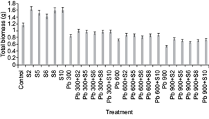 Figure 1 shows that lead contamination reduced the total biomass of plants as compared to plants grown in control without inoculation and contamination. However, application of lead tolerant bacteria reversed the toxic effect of lead on plants and enhanced total biomass of plants at all levels of lead contamination. Among all isolates, isolates S2, S5 and S10 showed most promising results at all levels of lead as compared to other isolates.