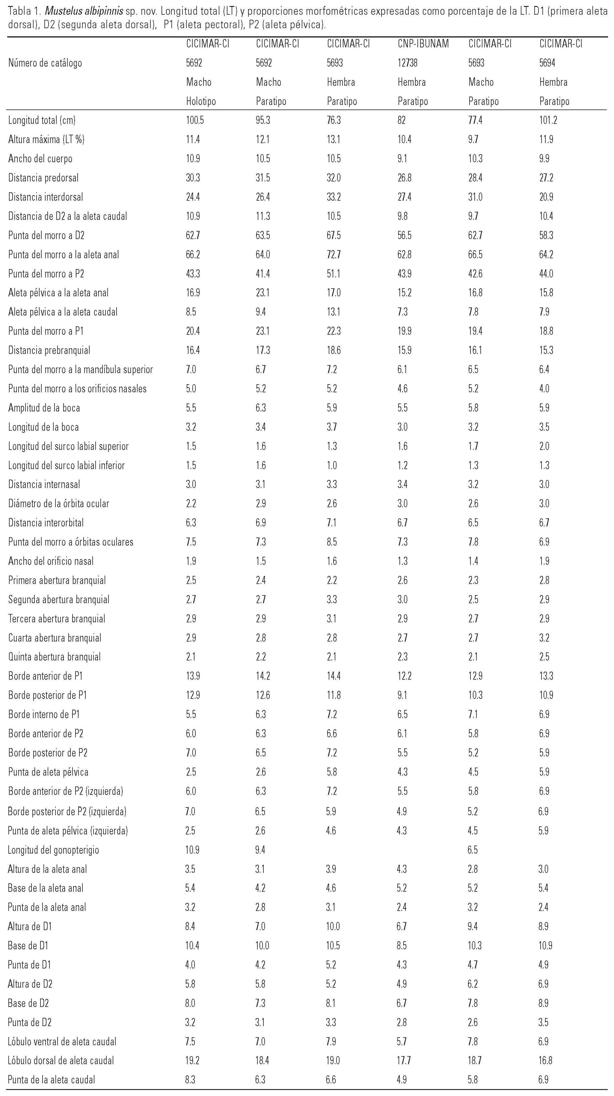 Comparaciones: Las comparaciones con otras especies de Mustelus, se hicieron con base en los materiales catalogados en la Colección Ictiológica del CICIMAR-IPN y Colección Nacional de Peces (CNP-IBUNAM) y los datos que ofreció Heemstra (1973): M. albipinnis sp. nov. se distingue de M. henlei por una distancia internasal más amplia (de 3.0 a 3.4, vs. 2.6 a 3.0% de LT), además de que los dientes no tienen cúspides secundarias y la presencia de dentículos lanceolados (Fig. 3) y porque los bordes posteriores de las aletas dorsales son enteros y cubiertos por piel. Se distingue de M. californicus por tener el cartílago pálatocuadrado dividido en dos elementos y no en cuatro (Fig. 2 C); además por el mayor diámetro de su órbita ocular (2.2 - 3.0 vs. 1.9 - 2.3% de LT) y porque el lóbulo interno de la aleta caudal está bien desarrollado. M. albipinnis se puede separar de M. lunulatus con base en su mayor número de vértebras (92 vs. 77), su mayor distancia interorbital (6.3 - 7.1 vs. 4.3 - 4.9% LT) y a que sus surcos labiales inferiores no son tan largos como los superiores. La nueva especie difiere de M. dorsalis en el patrón de los dentículos bucofaríngeos (Fig. 4) y al diferente tamaño de la base de la primera aleta dorsal (8.5 - 10.9 vs. 11. - 16% LT). En la especie M. whitneyi, su distancia interdorsal es menor que en M. albipinnis (16 - 21 vs. 20.9 - 33.0), mientras que M. mento, en todas las tallas, presenta pequeñas manchas blancas redondeadas a los lados del cuerpo y cuando juvenil presenta barras oscuras verticales. Existen otras dos formas no descritas todavía en el Pacífico oriental (Heemstra, 1973; Heemstra in: Compagno, 1988), sin embargo los bordes de sus aletas dorsales, pectorales, pélvicas y anal no son de color blanco y las pélvicas de las hembras son semejantes en forma y tamaño, independientemente de la talla. Por otra parte, todas las demás especies del océano mundial hasta ahora conocidas carecen de los bordes y ápices de color blanco en las aletas antes mencionadas y que son característicos de M. albipinnis, además del interesante aspecto morfológico de la disparidad en forma y tamaño de las aletas pélvicas, aquí descritas.