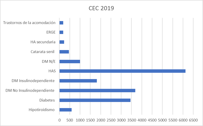 A partir del año 2018, con la creación del Centro de Enfermedades Crónico-degenerativas (CEC), se logró incrementar el número de atención a pacientes. En tan solo dos años se duplicó el número a 43 747 y se atendió diferentes patologías. Los indicadores de las principales patologías se exponen en las Figuras 2 y 3.