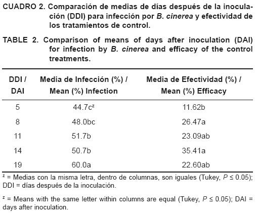 En este estudio, la infección general por B. cinerea se incrementó progresivamente: el mayor valor se presentó a los 19 ddi con 60 % de daño en la planta y 22 % de efectividad, tal y como se observa en el Cuadro 2.
